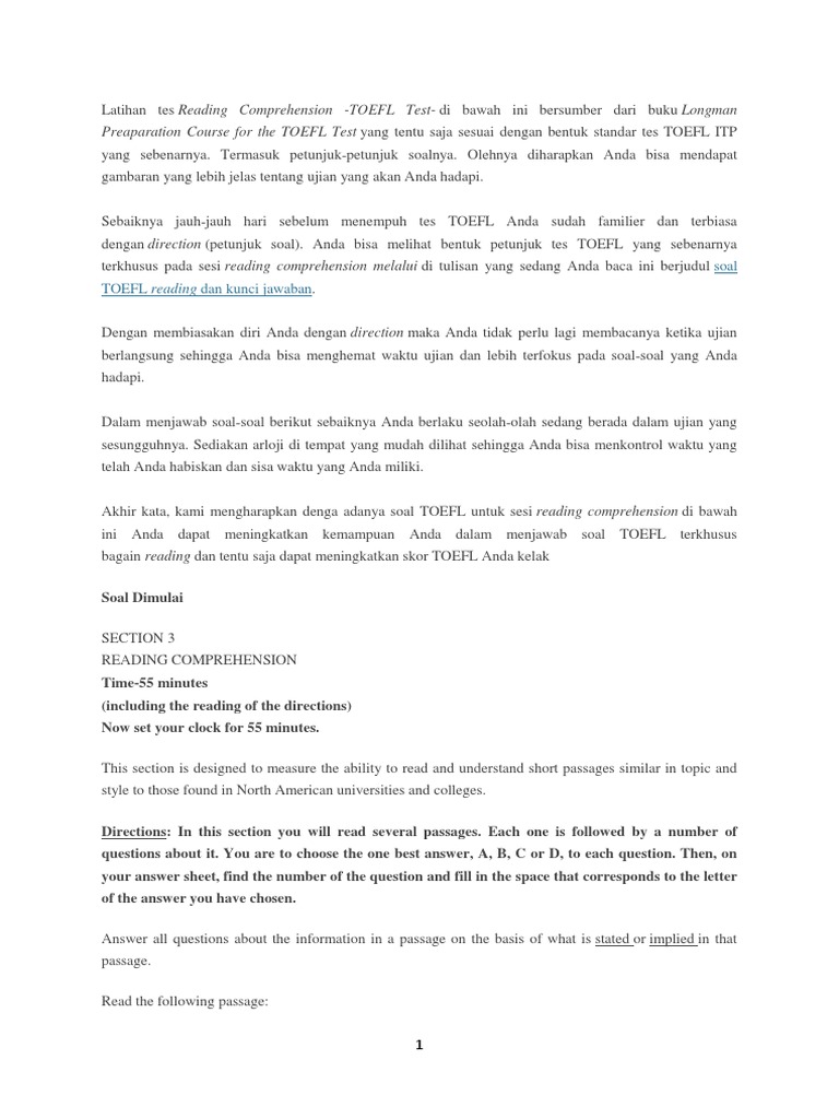 Advanced speech recognition & artificial intelligence provides fun reading help anywhere Feb 23, 2020 · (including the reading of the directions) now set your clock for 55 minutes. Download soal structure toefl dan kunci jawaban scholars official. Reading comprehension passage 3 the cause of tooth decay is acid which is produced by bacteria in the mouth. This section is designed to measure your ability to read and understand short passages similar in topic and style to those that students are likely to encounter in north american universities and colleges.